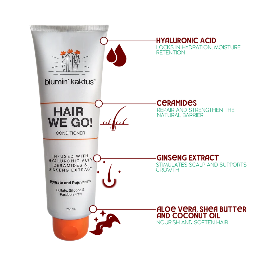 Blumin Kaktus Hair We Go! Conditioner is a nourishing and hydrating hair conditioner enriched with hyaluronic acid, ceramides and ginseng extract. Designed to deeply hydrate, strengthen and revitalize hair for a soft, smooth and manageable finish.