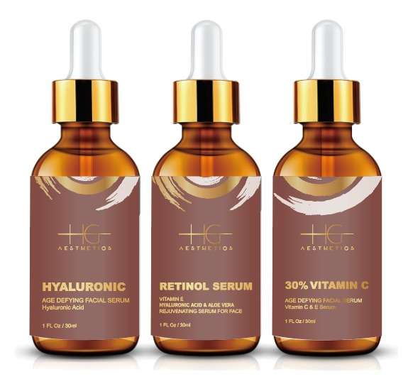 Experience the ultimate skin makeover with HG Serums Set: Hyaluronic Acid, Retinol, and Vitamin C. This trio of serums from HG AESTHETICS effectively rejuvenates dull skin, providing a stunning natural GLOW. While each serum stands on its own, the combined power of three delivers even better results. Enjoy the added bonus of a refreshing and indulgent scent in every product.