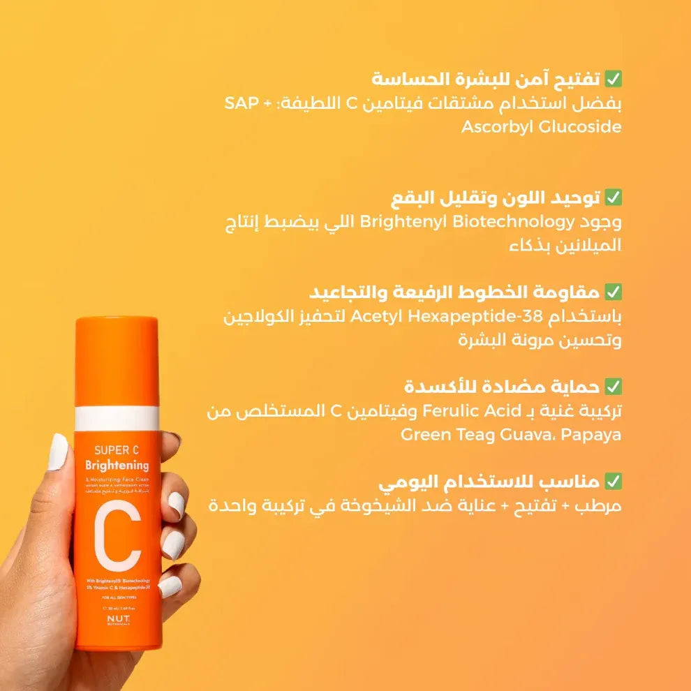 Nut Botanicals Super C Brightening and Moisturizing Face Cream is a lightweight yet deeply hydrating cream that helps brighten the skin, improve texture, and restore natural radiance. Infused with Vitamin C and plant-based extracts, it works to even out skin tone and reduce dullness and signs of fatigue.